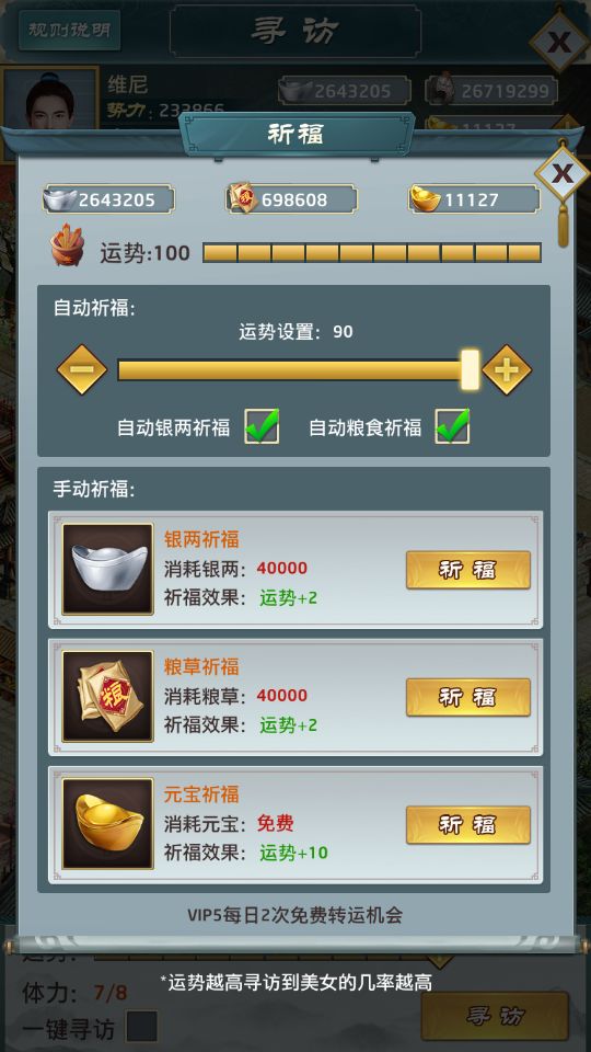 而运势越高,遇到妻妾的几率就越高。建议无氪玩家在寻访前,一定等到运势恢复到90(自然恢复只能到90)之后再开始寻访,如果氪金,建议逆天改运到100之后再寻访