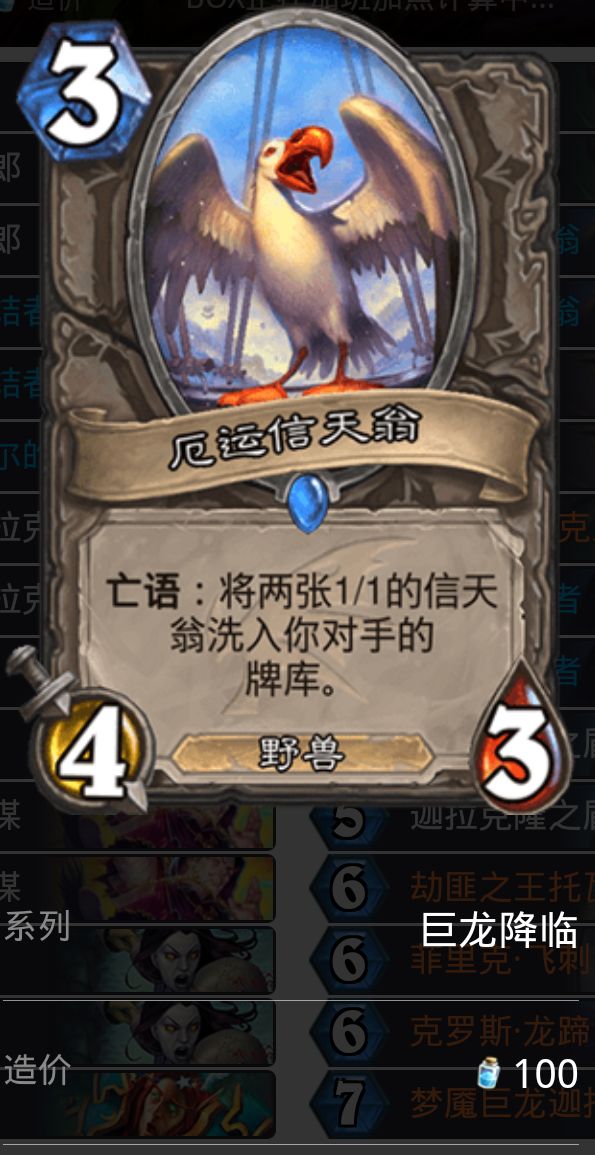 单卡解析:作为巨龙版本的佼佼者,强力的亡语可破坏对方节奏以及破坏对面宇宙体系,带两张的原因就是怕对面直接抽到鸽子导致没有破坏宇宙体系,对我方造成威胁,毕竟姐夫和新红龙女王两张强力单卡非常恶心,尤其新红龙九费直接拍三个大怪会让贼触不及防(没有群解的贼很想念曾经的消失),还有高贵的野兽属性和四三的身材也让对面头疼