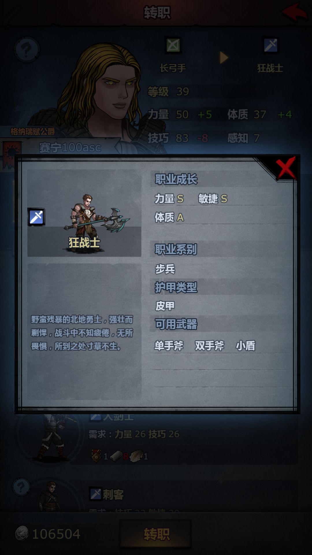 ⑵狂战的要求:官方推荐是古特雅儿,拥有力体敏S的属性,和狂战职业完全吻合但是技往往都是E,这让狂战几乎没有暴击,甚至大多数时候没有偏斜就算好了(但是在很多时候狂战偏斜也能秒人,加上乘胜追击3后,有没有技巧都差不多),所以赛宁王族便进入了大家的视野,赛宁在力体S的情况下技也可以达到S,虽然敏最多只有A但是经过大佬们的的测试就算敏为B也可以满足日常需要