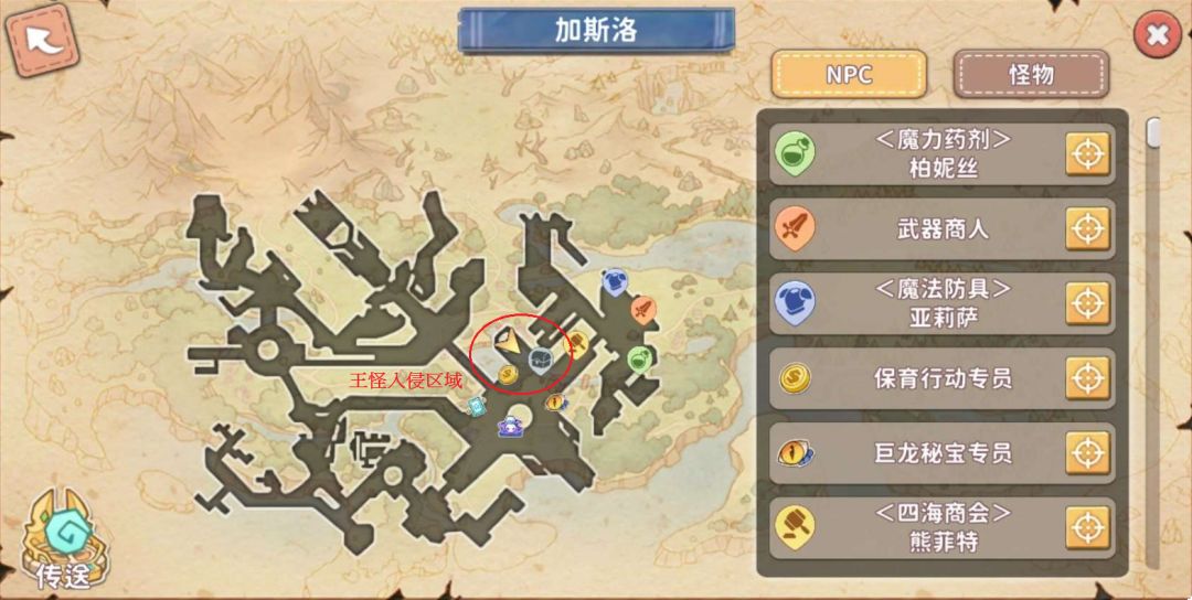 ※点选地图→点选右上方大地图旁的放大镜→在世界地图的页面选择加斯洛→传送到加斯洛 【下图红圈处】