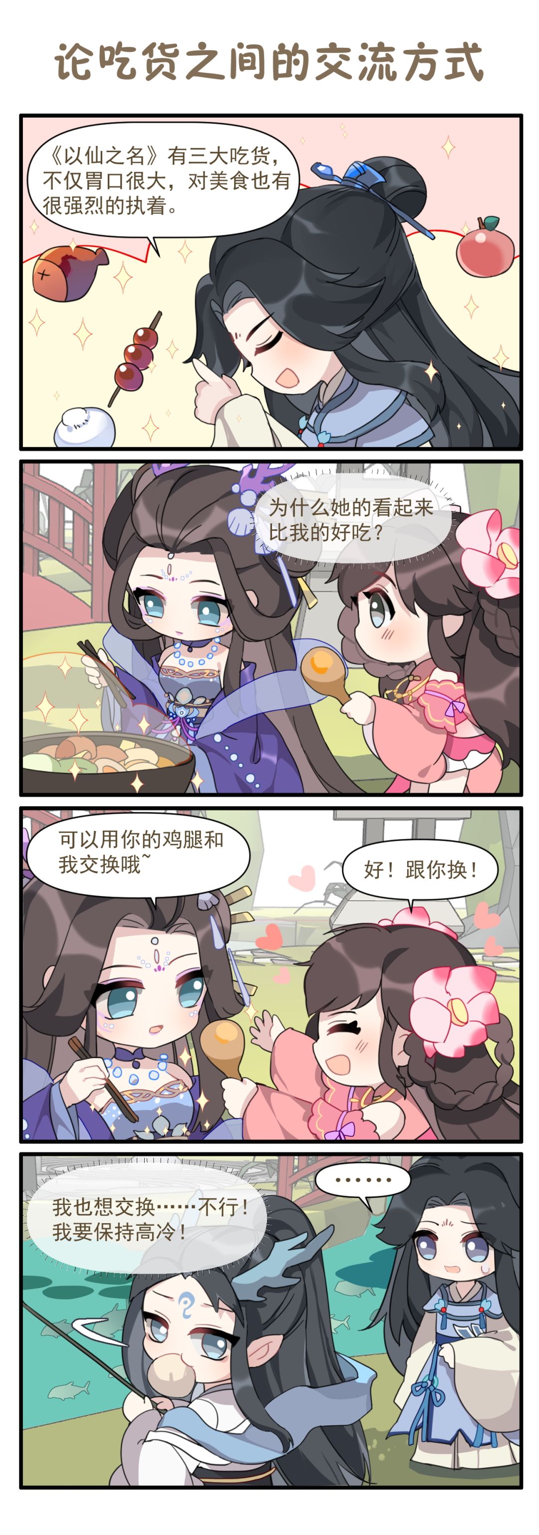 众所周知,《以仙之名》里的吃货角色还真不少,今天的四格小剧场,让男主带着道友们看看吃货之间是如何交流的,看完你也许能学到些什么哟~