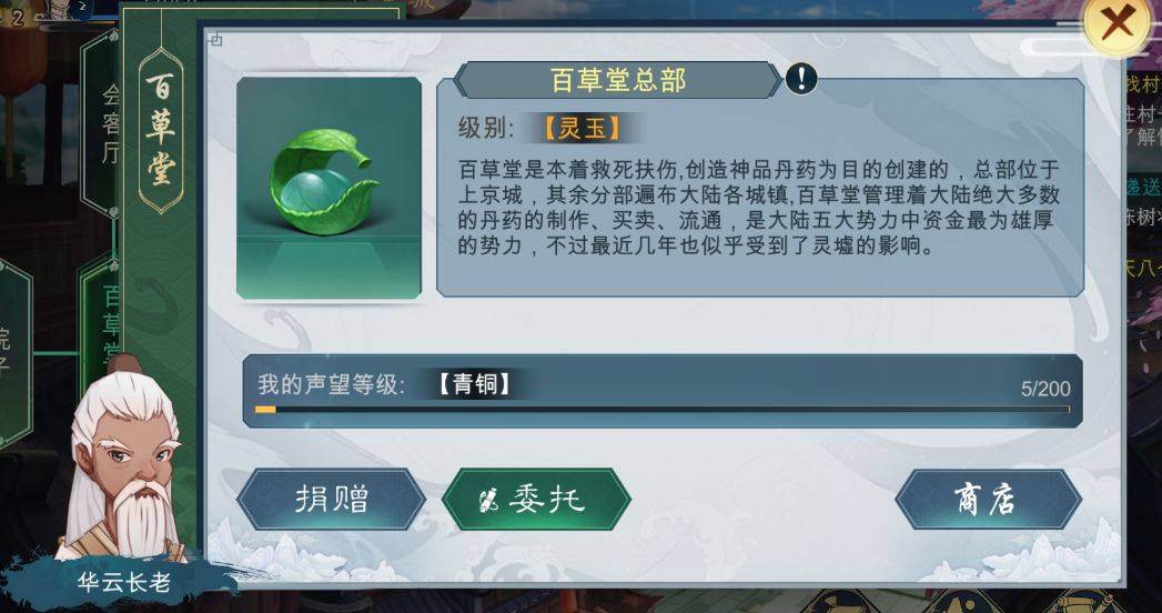 倘若大家想要购买学习更高级的丹药配方,便需要提升在百草堂的声望了。想要提升声望,便需要大家在各地的百草堂掌柜处捐赠炼制好的丹药或完成委托任务,当然无论是捐赠丹药还是完成委托任务都会获得一定的奖励的(毕竟没有人会傻到白给东西不要好处)。江湖势力的声望等级分为:青铜→玄铁→白银→黄金→灵玉,每个等级的声望集满后都需要完成晋升任务才可以提高声望等级~