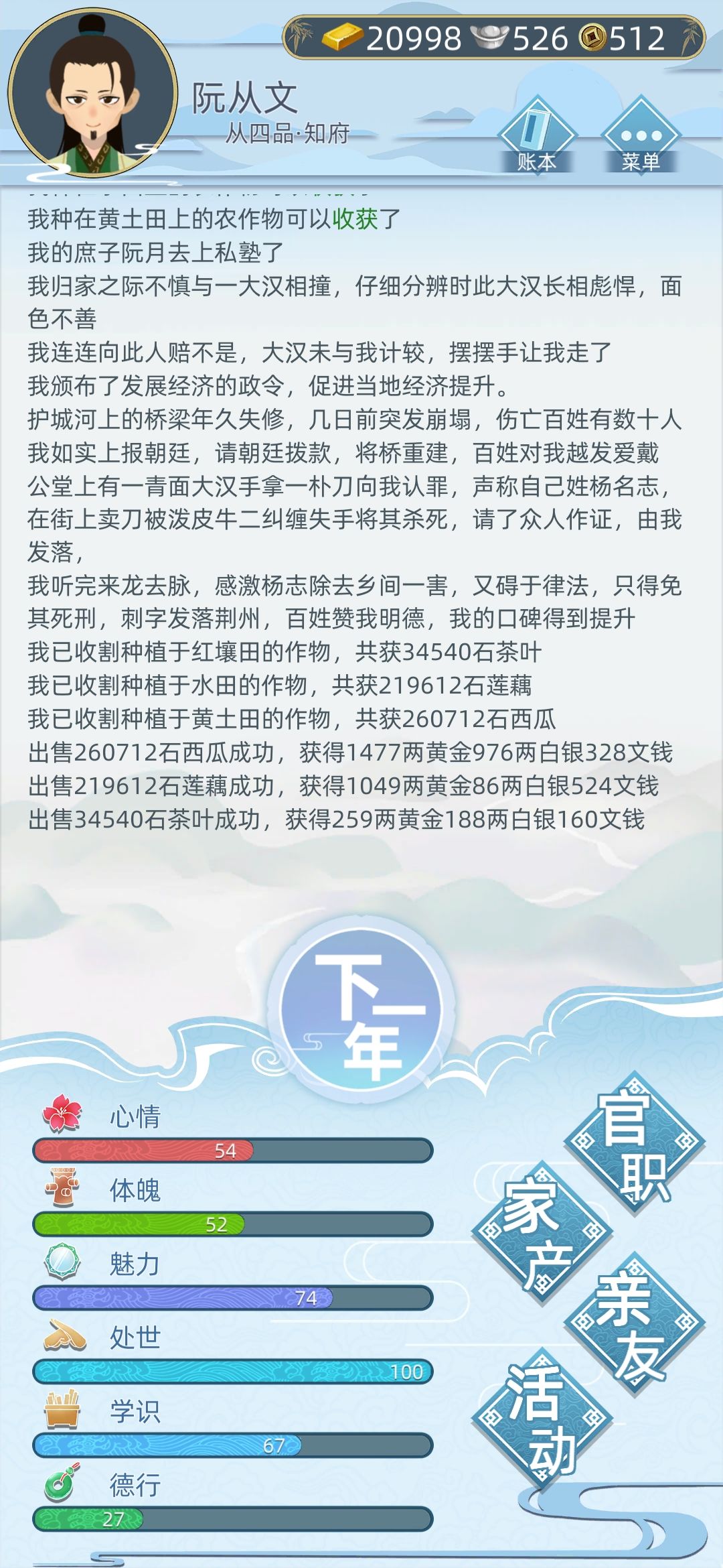 5.重复上面的刷到16岁左右就会有娶亲(●✿∀✿●),我是无所谓的随便挑一个,如果你们想要一个好看的,可以这样操作去找媒婆之后选择第二个找知己,这个可以看脸挑一个头像好看的,再看看评价,如果你魅力高的话好像可以一次过,不然就会一直被拒绝,多试几次吧,等成了之后要你给一百两或者两百两之后她就当你妾室了,赶紧多生几个吧,再说说如果你不主动去找老婆你父母会帮你找,之后你挑一个好不好看就看运气了,我第一局是一个不好看的所以我就逃婚了,之后我发现我道德没了,再之后考科举的时候三题全对照样落榜😤同时我发现我找不到老婆了😱全都拒绝你的,等过了要差不多10年人物年龄30多了终于有一个同意的,娶来发现是一个神一般的婆娘魅力无限接近于零,吓得我差点把手机丢了,想再逃婚父母不同意了只能完婚了😞过了几代才发现可以等三年休妻就没什么影响的,但血脉已经被糟蹋了,后三代魅力没高过50的😖直到后来知道了怎么挑小三才把魅力挽救回来
