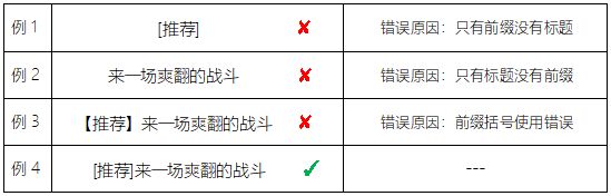 正确的标题组成格式应为”[前缀]+标题“,标题不能只写前缀或者不加前缀只有标题,前缀需确保使用的括号正确,前缀内容根据实际使用环境自拟,常见前缀为[推荐]、[合集]、[资讯]、[评测]