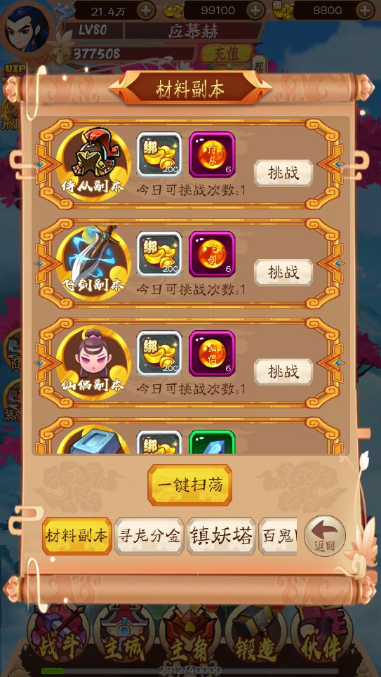 随着玩家的等级提升,逐步会开启不同的材料副本,每个材料副本每天可以免费挑战一次,之后可以使用元宝进行扫荡~挑战胜利后可以获得大量绑元以及对应的材料奖励哦~