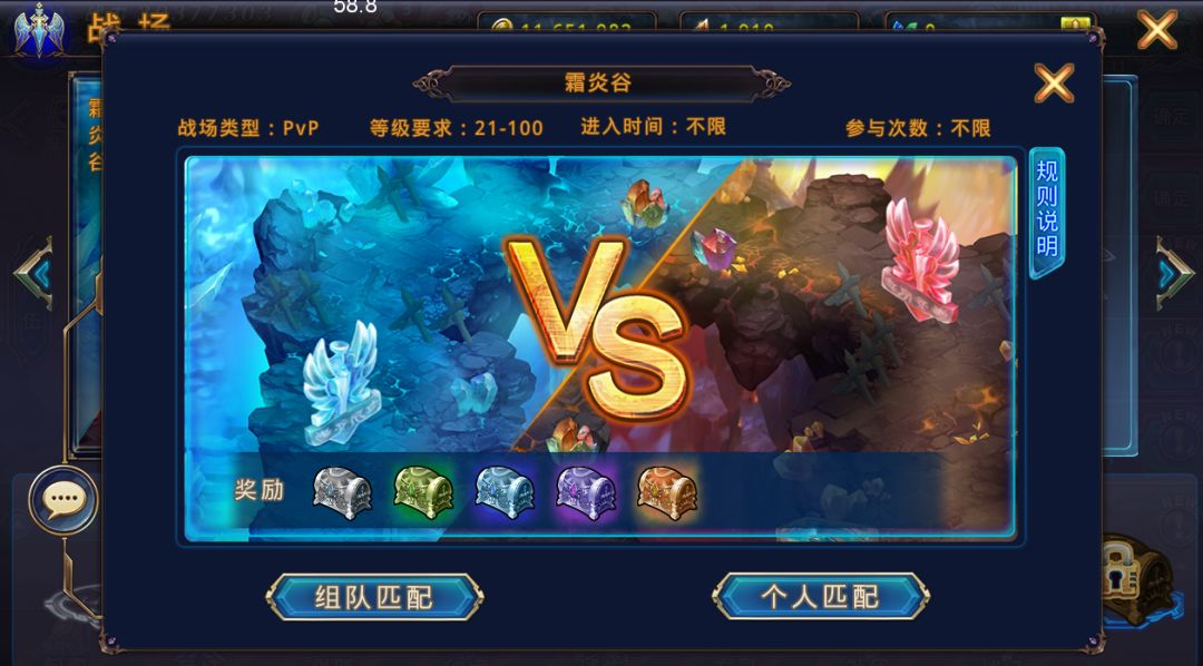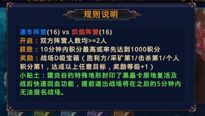 唯一产出【战术】的PVP活动——限时开启的多人战场霜炎谷。每天晚上限时开启,最少4人就可参与啦~!