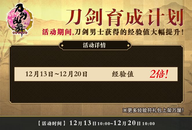【活动详情】活动期间,刀剑男士获得的经验值提升至2倍!请审神者不要错过育成刀剑男士的时机。同时,多种经验符礼包上架万屋特卖,搭配使用能够助力刀剑男士更快成长!