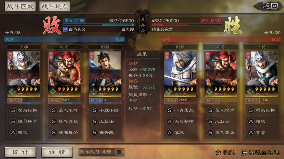 最终由于等级的差距我方惜败,我方以2万6千兵打敌方3万兵,没有兵种和等级优势下,打倒了敌方2万5千余兵,若是双方都是50级,这场胜负明显是我方马超获胜了。