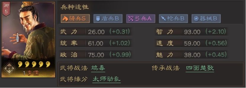在游戏中,李儒是群雄武将,主打输出辅助。自带战法【鸩毒】兼具伤害和降低统率的效果,其战法发达概率更是高达70%。在兵刃输出队伍中是一个不错的辅助武将,配合战法【避实击虚】能有弱点击破的效果。