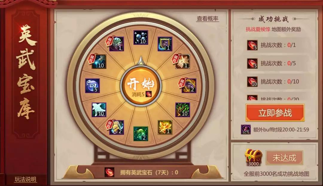 【英武宝库】其实是一个抽奖转盘,通过挑战地图免费得到的【英武宝石】,它就是开启这个转盘的钥匙啦。活动规则如下: