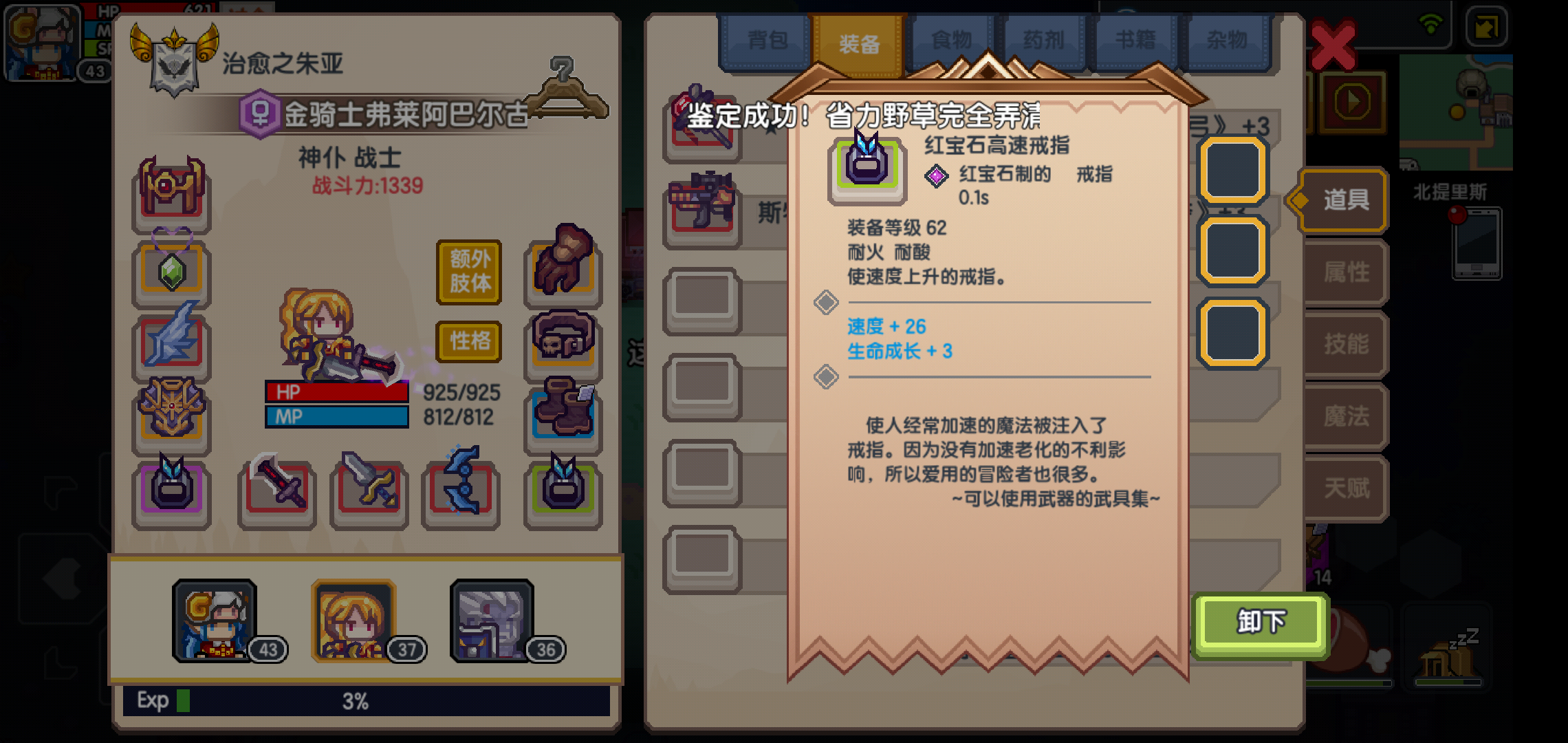 今天搞到了第三个高速戒指,布制的…改变下材质时顺手把其他装备也改了…然后发现,材质改变后不换一下装备效果不会刷新(算上戒指我搞了3个红宝石材质,结果生命成长和生命值一点没加…直到我换了装备)