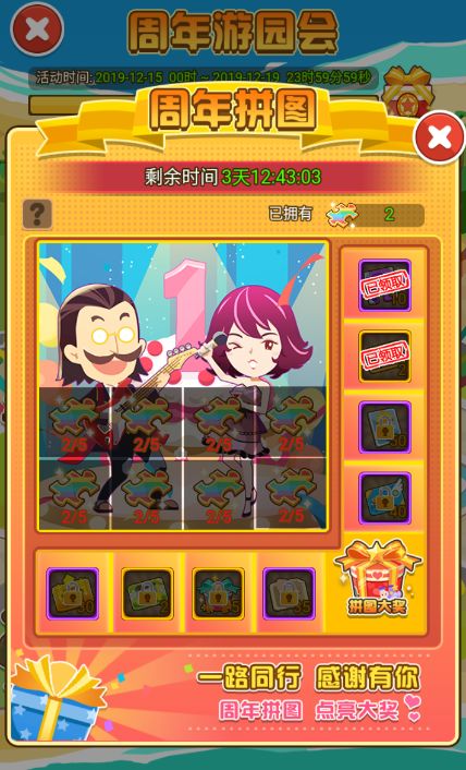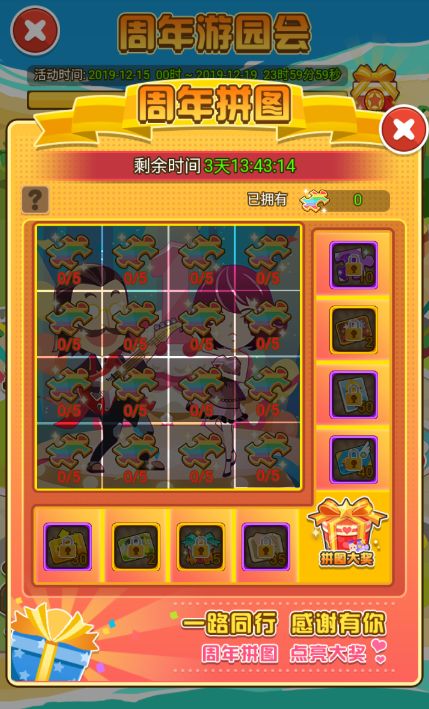 在【周年飞行棋】里攒到的拼图碎片就是在【周年拼图】里使用啦~在这个4X4的格子里,每一行每一竖都有相应的奖励可供解锁,只要你的拼图足够多,横竖都有奖!
