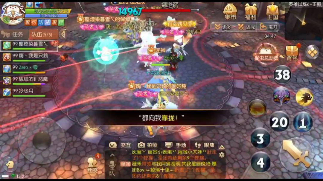 “大家都站在一起!”当Boss说这句话时,玩家脚下会出现红圈。大家千万不要被Boss欺骗而站在一起,否则会全军覆没,五个队员分开站在不同的地方即可。由于此技能带追踪效果,伤害比较高,神官可以给队友一个无敌技能,以便安全度过。