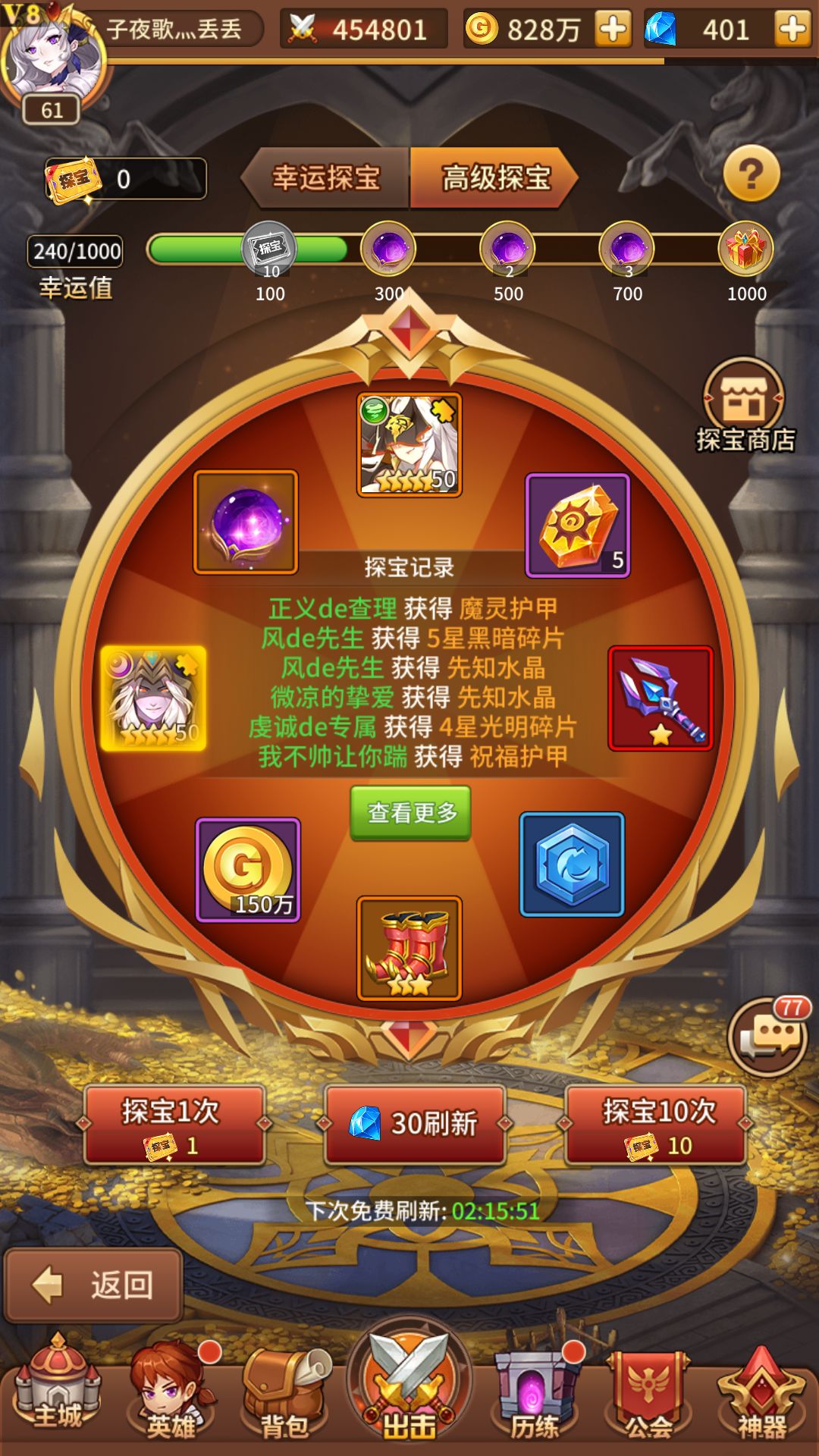 第四个渠道则是探宝,很多朋友都会忽视探宝,没有券就不想刷新池子,有了券随便找个池子抽之类的,其实非常的亏....探宝的正确玩法应该是攒够大量的券,然后没事就刷新池子,甚至有特殊需求或者着急某系的朋友可以花钻石刷新池子(如高级探宝有风喵/暗主/大祭司/潘多拉等 普通探宝有美杜莎/剑豪等)。