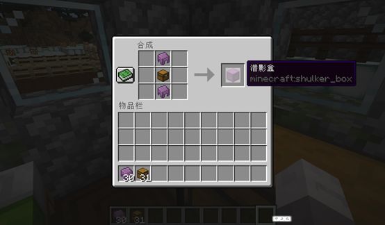我们需要准备两个潜影壳和一个箱子,接着如上图摆放即可合成潜影盒了