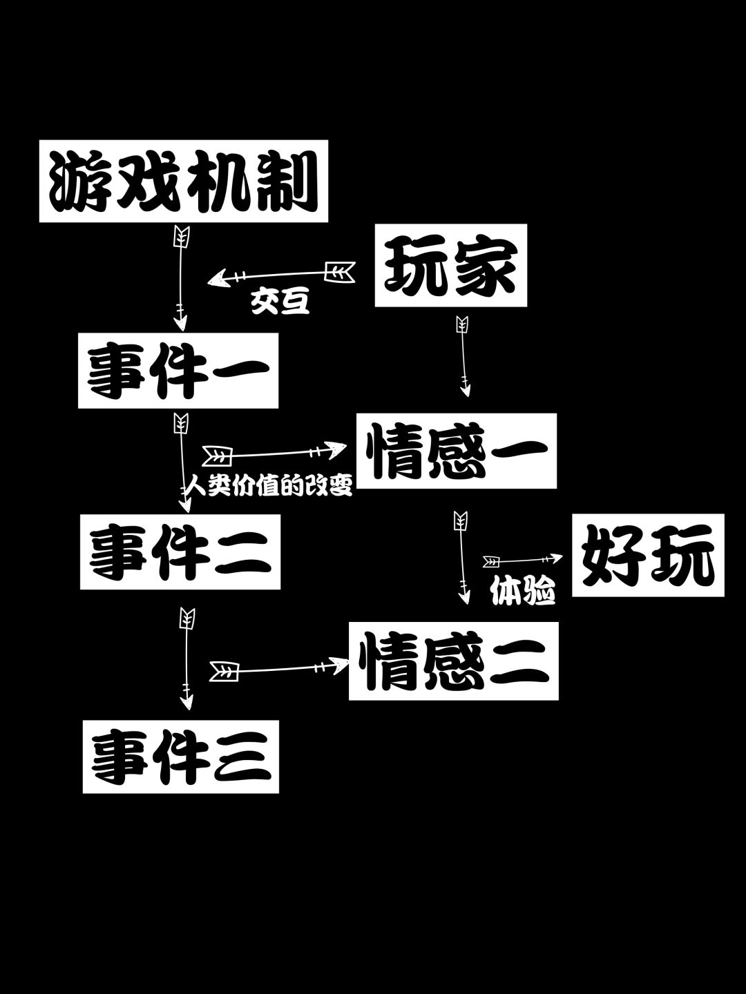 简单总结就是这张图,“游戏机制与玩家交互产生事件,事件的发生改变了对于玩家有价值的东西,导致玩家产生情感。”