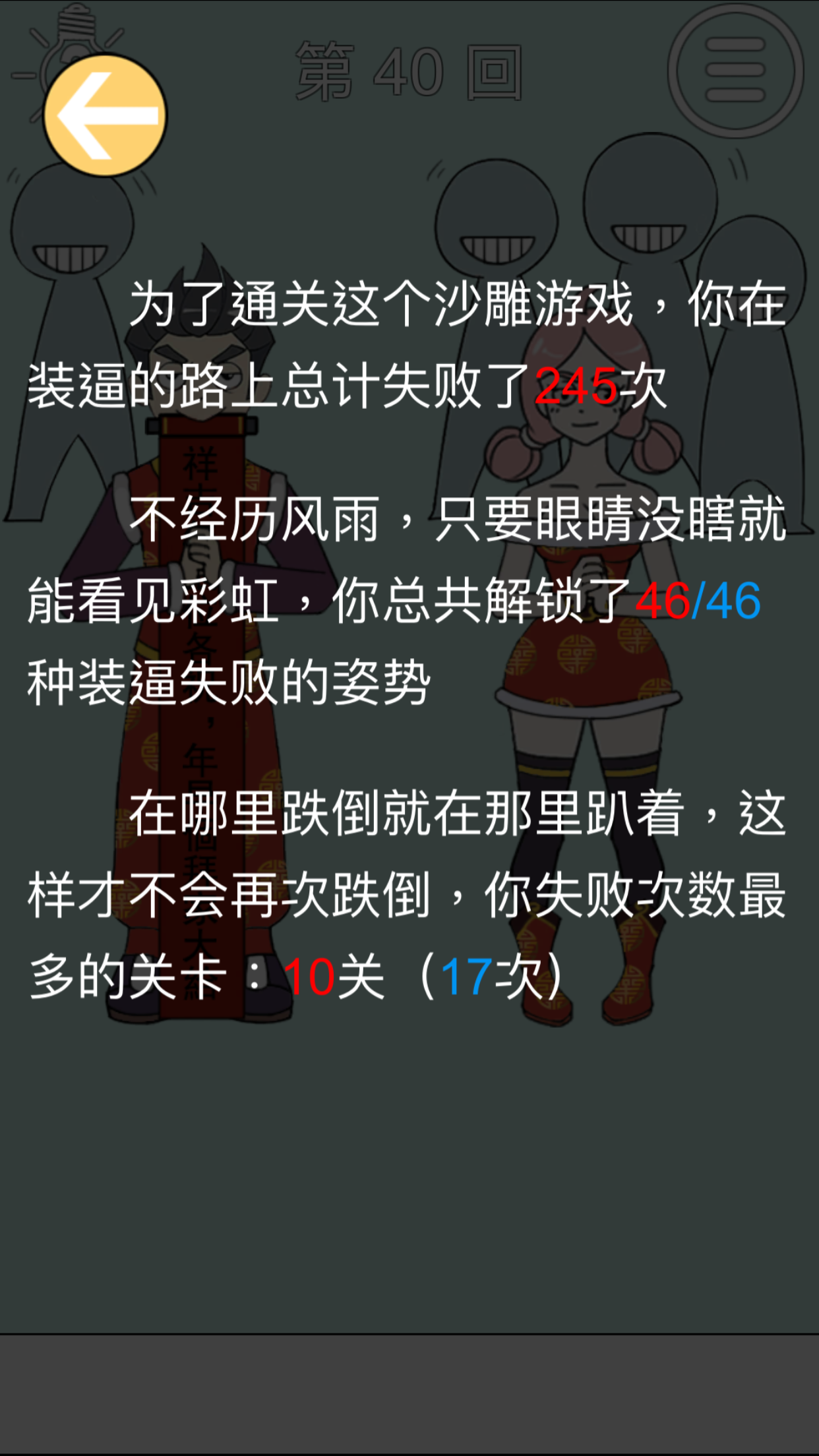 游戏通关以后还有一个非常有趣的小统计,记录了玩家总共的失败次数,失败方式,还有失败最多的关卡和次数。看着这一串数字,玩家仿佛看着自己一步一个脚印的走向通关,为了装X成功的努力付出,露出了欣慰和满足的围笑。