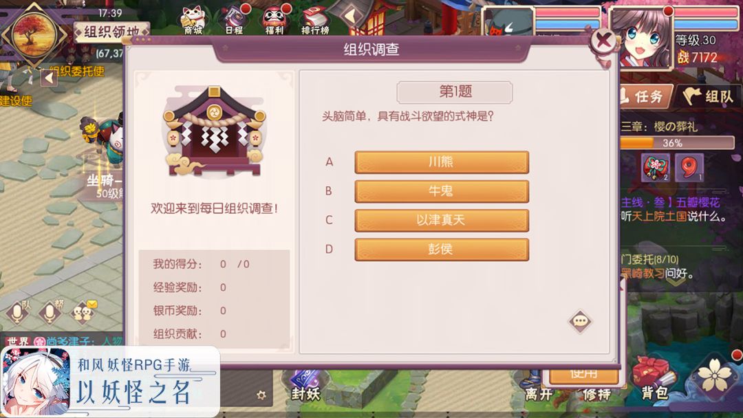 组织调查是答题型的活动,组织主管会出一系列跟游戏相关的选择题让玩家进行回答,只要对游戏有些了解都能轻松回复,如果有不懂的可以在题目右下方点击消息图标在组织聊天窗口中寻求帮助。