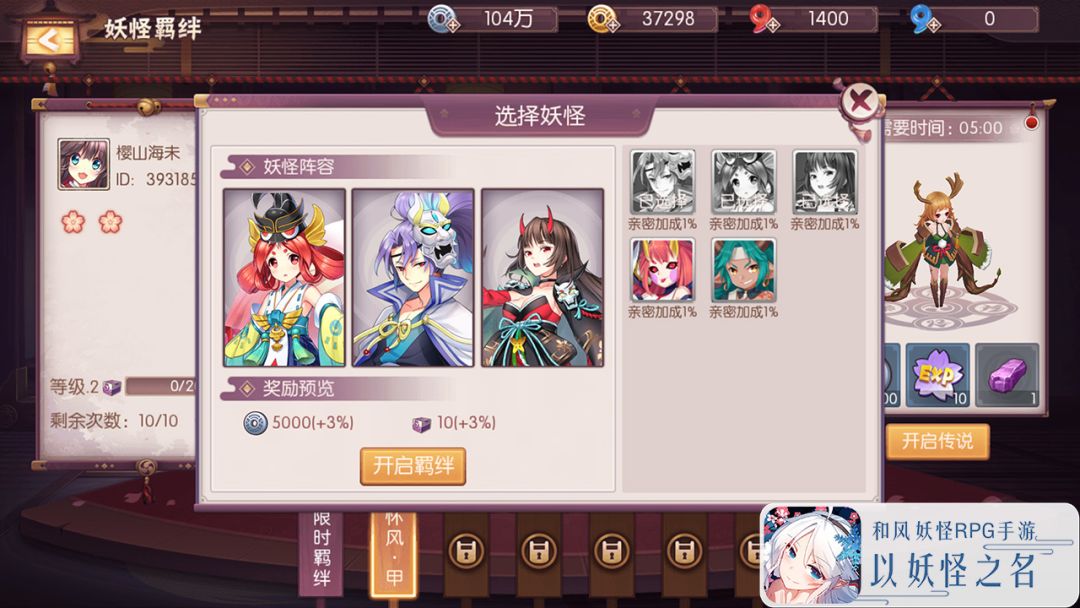 妖怪羁绊是放置型休闲玩法,选择妖怪阵容开启羁绊,要满3名妖怪才能开启,一段时间过后就可回来直接领取奖励,轻松至极。