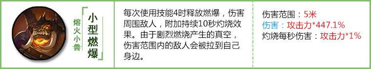 熔火小兽是非常强力的攻击型宠物,技能伤害很高,而且每次升级后能提升208.7%的伤害。像是艾丽娜-冰川、威尔萨克-箭雨之影等CD短的技能,短时间内就可以触发多次。