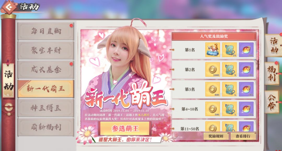 1、新一代萌王:在社区中上传照片,点赞集人气!人气最高的红线仙成为“新一代萌王”,将获得迪士尼一日游门票x3、往返路费、迪士尼酒店套房、以及相关差旅与餐饮费用报销,可以带着自己的闺蜜们一同前往哟!还有夺宝卡、五彩珠、超值Q币等诸多奖励。同时参与投票的玩家也将获得中级赤炼药丹x3。