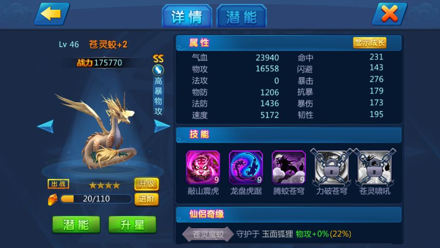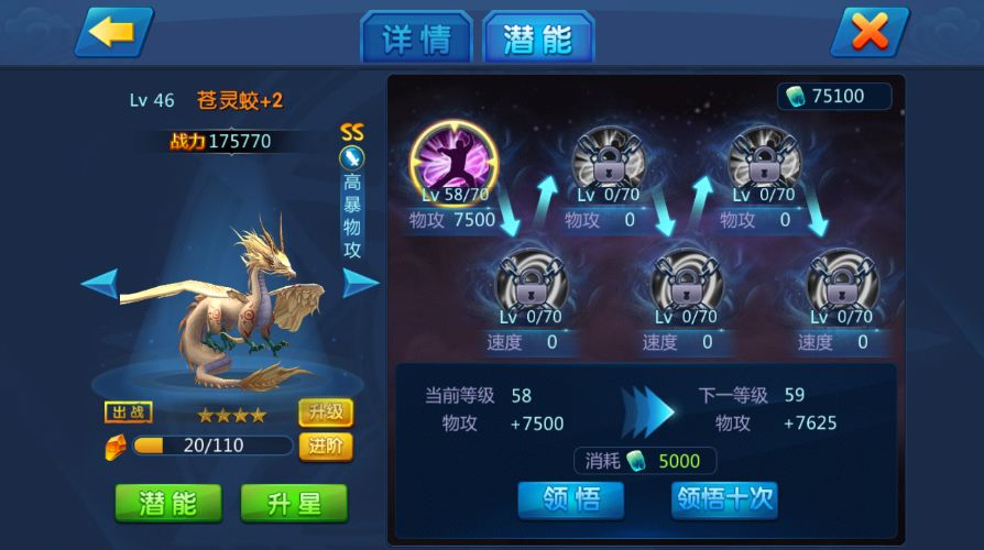 灵兽拥有6个潜能,通过消耗潜能点来提升潜能等级!