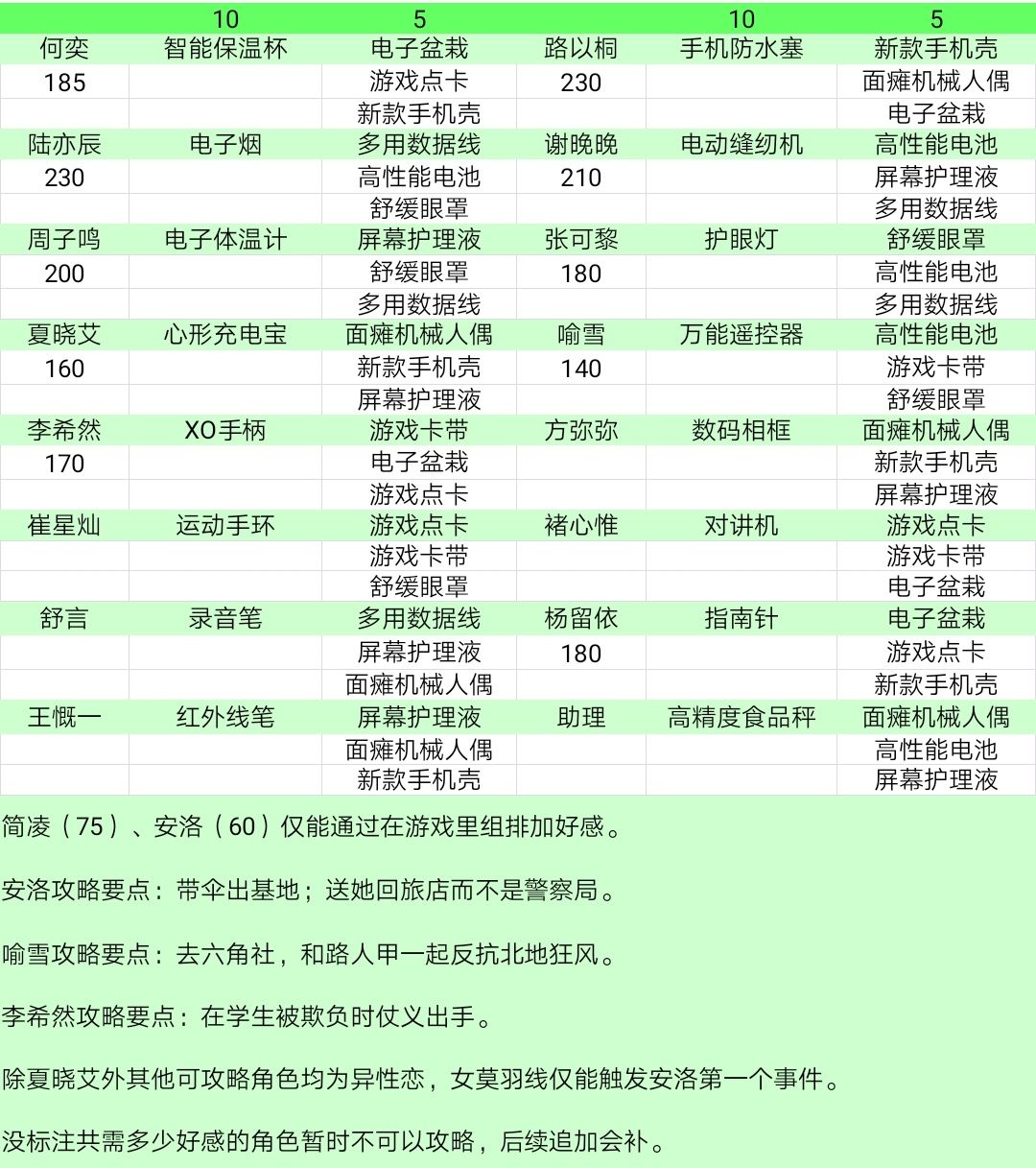 礼物攻略表