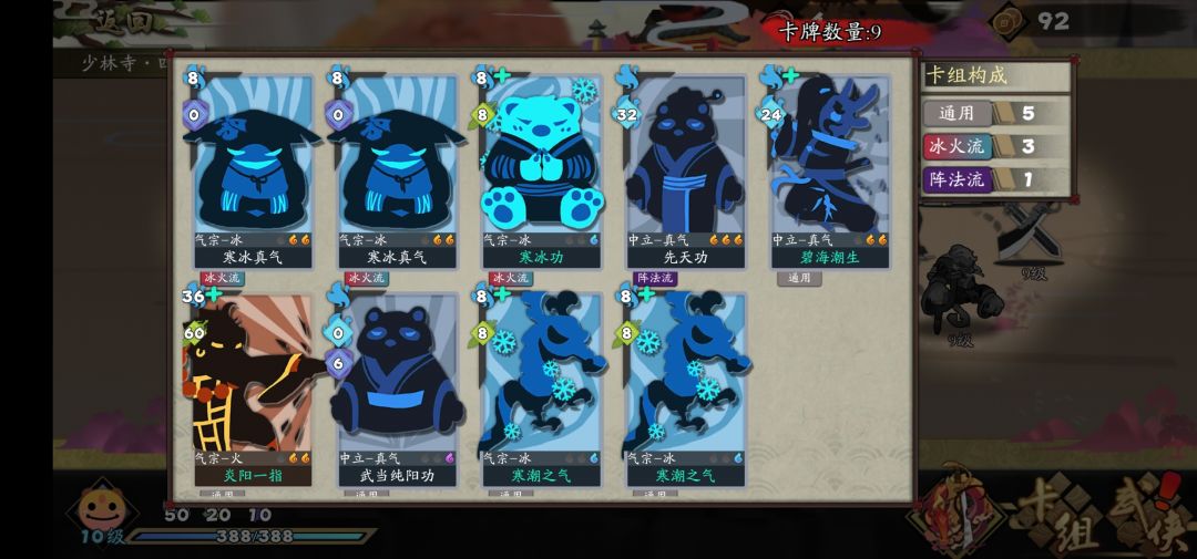 对套装没什么要求,有个上毒的十步,和增加抽牌的最好。冰冻转灼烧用来增伤也行,其他就是能让你活到套路成型即可。卡组里的效果是2张抽牌2冰冻时回护甲,2张冰冻时抽牌2,一张冰冻,一张回气真气盾,一张回气,一张输出,一张一次性的大量回气。实际上还可以减少也还可以增加卡牌。目的就是达成抽牌回气循环。神兵倚天屠龙即可,最少需要单屠龙,目的是精简卡组。