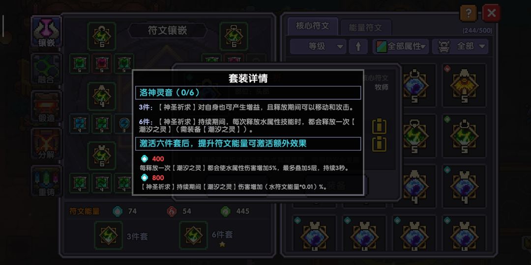 花了3天肝装备,3天撮合套装与符文,我个人走的雷火牧,现在做出水6件跟木6件,总结出纯水套,水木套和纯木套,这三个只要凑齐符文就能用,不讲究能量,没做过火套,强度不太清楚。