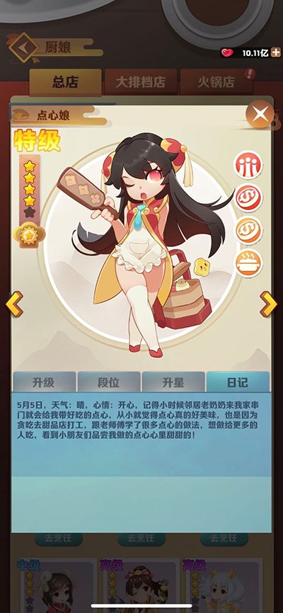 一般来说厨娘身上没什么肝的点和氪的点,基本靠日常挂机就可以满足厨娘的升级需求,还是挺良心的。特级厨娘升星升段,其他厨娘升星不升段,反正升了段也用不上,和特级的属性差太多了。在没特级厨娘的时候用高级厨娘代替。刷到特级厨娘后,月卡玩家可以直接替换了高级厨娘,省点爱心,30-41级时小氪玩家可以等开新店的时候买个爱心的礼包再替换,这样可以保持每天1-2级的升级,而且换上的厨娘可以提前满星满段的,比较流畅(个人主观感觉- -)。