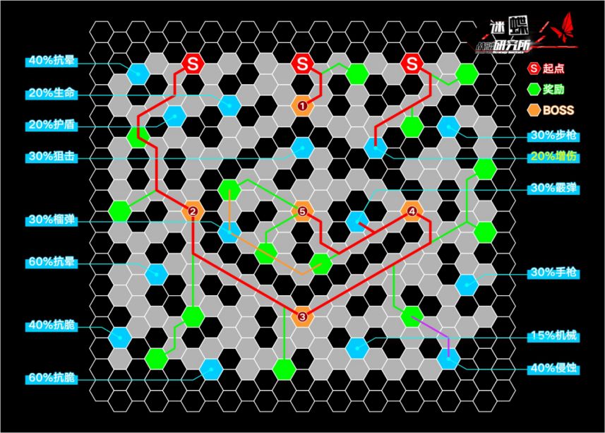 这里的蓝点是霰弹增伤,应当作为最高优先级别的攻略点位,因为对抗这期的BOSS誓约丽达和旗袍无忧是主要战斗力,这个蓝点能极大提升之后对抗5号BOSS的效率和分数。