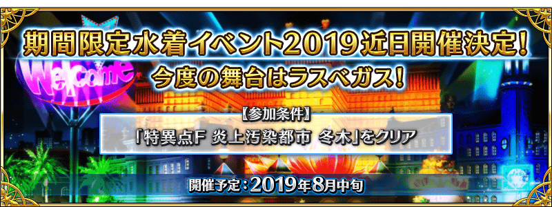 泳装四期活动预定8月中旬开始。 需要完成特异点F。活动舞台为拉斯维加斯