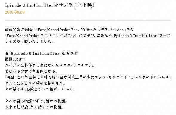 TV动画『Fate/Grand Order 绝对魔兽战线 巴比伦尼亚』第0话「Episode 0 Initium Iter」视觉图等公开,第0话已于FGOfes.2019会场先行上映