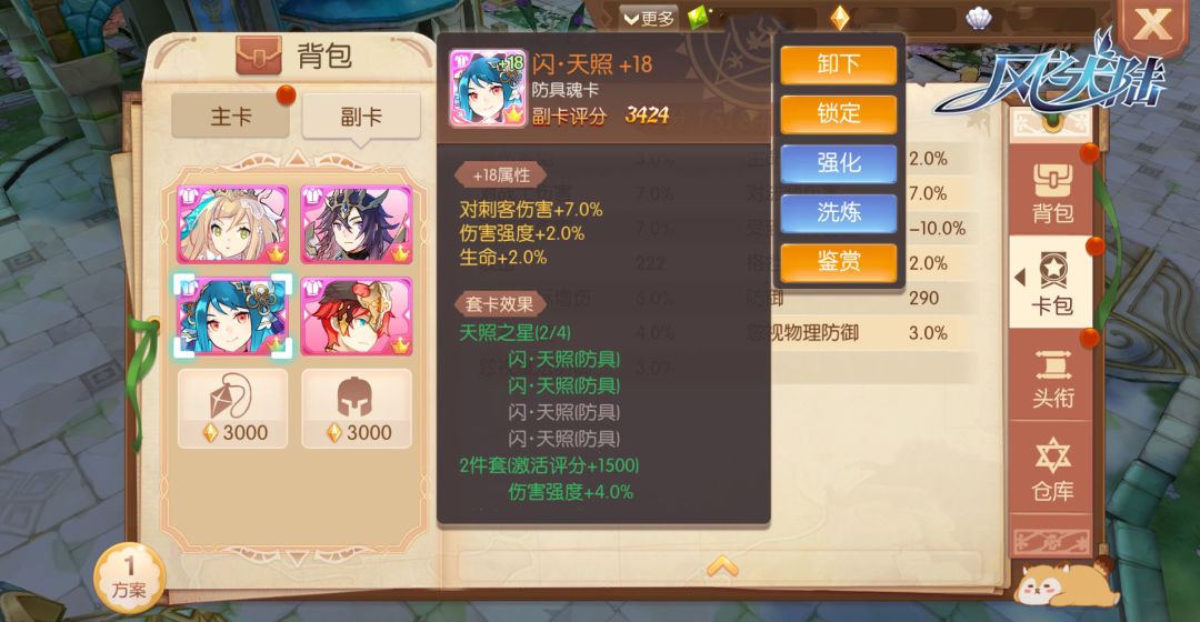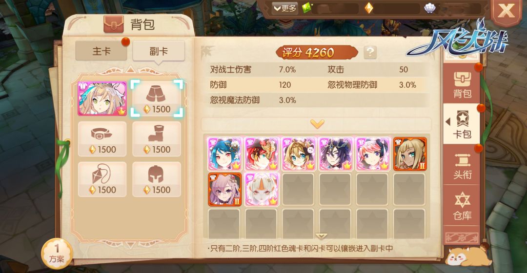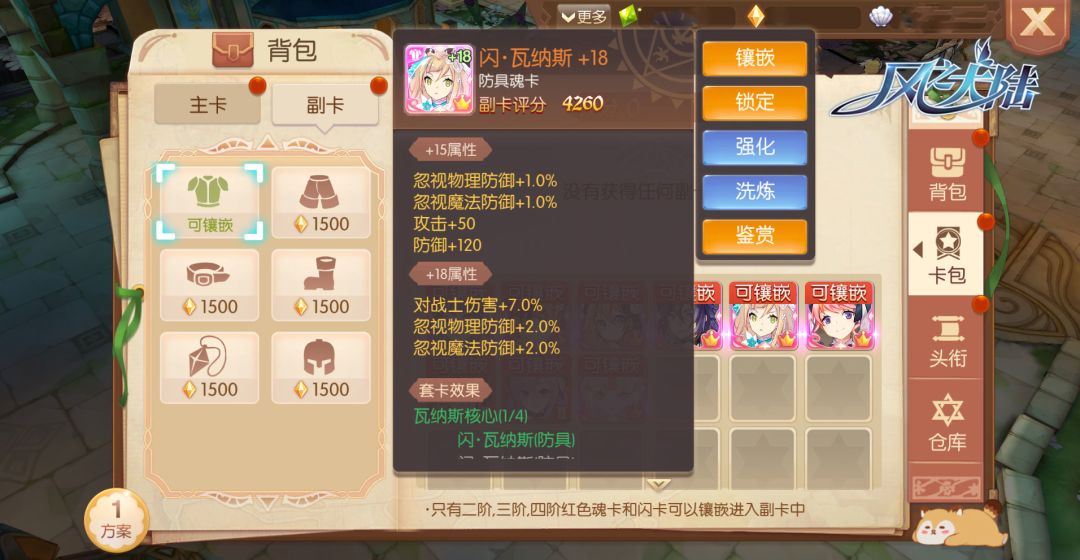 总而言之,大家的第一个副卡卡槽,可以结合你已有的红卡和闪卡情况与最想要的附加属性,再进行抉择。小狸再次温馨提醒各位,副卡卡槽上附加给角色的属性只有已激活的+15和+18对应属性方可生效,大家可以查看一下镶嵌在副卡上的魂卡是否洗练好+15或+18的属性哟~