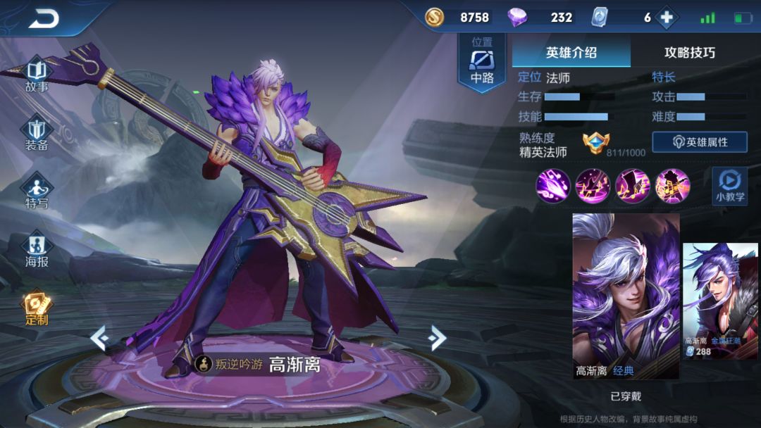 然后再确定一下高渐离的定位,高渐离名为法师其实是战士缺点明显优点也明显,高爆发高续航但是手断缺控。而且操作简单相对于别的中路更加注重的是团战跟意识,发育跟手速放在次位,因为星耀以上意识团战都能基本保证所以高渐离是可以有地位的