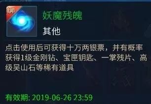 使用后必定获得10W银票,概率获得金刚钻,钥匙,残魄,高级吴山石等奖励。
