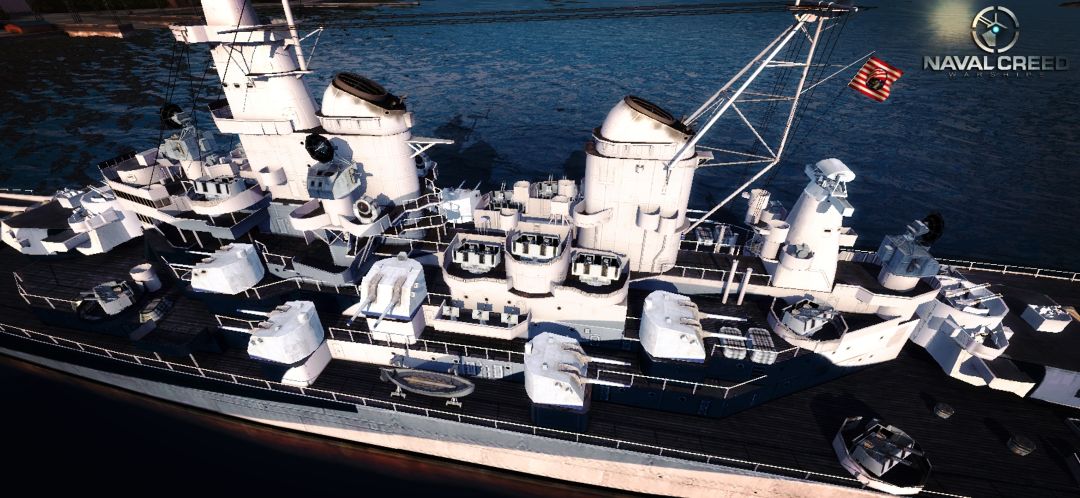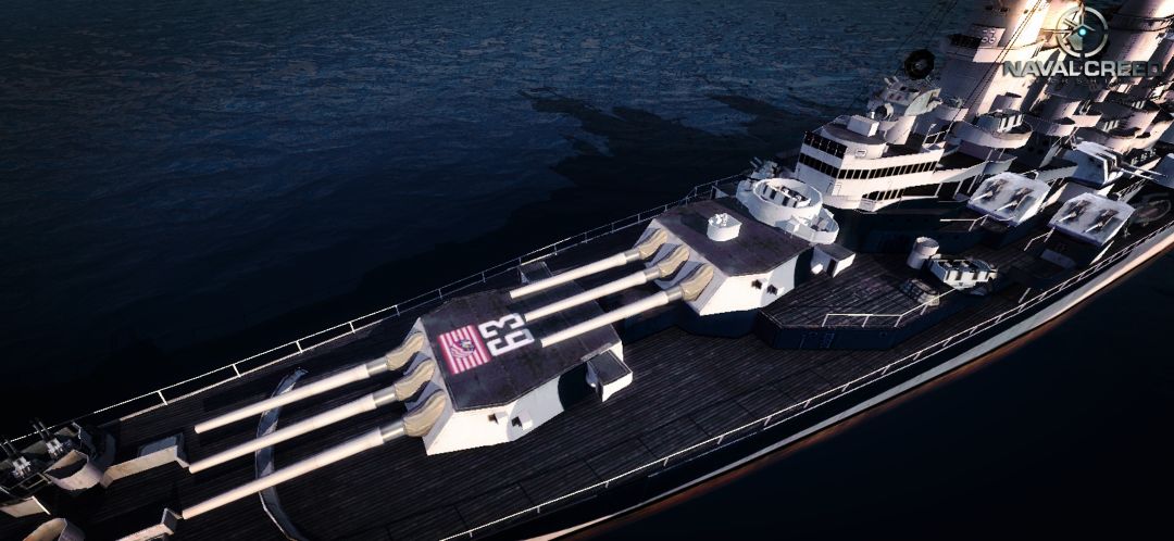 密苏里上搭载的三座造型硬朗三联装406mm口径MK7主炮更是无数战舰爱好者们的浪漫所在,其50倍径的长炮管大大增加了其壮观程度,加上A主炮的国旗与数字涂装和BX两主炮上防空炮组的点缀,在提升战舰整体军工质感上起到了至关重要的作用。相信看着这三门主炮朝着同一侧舷齐射,没有谁能顶得住这种大舰巨炮的浪漫吧。