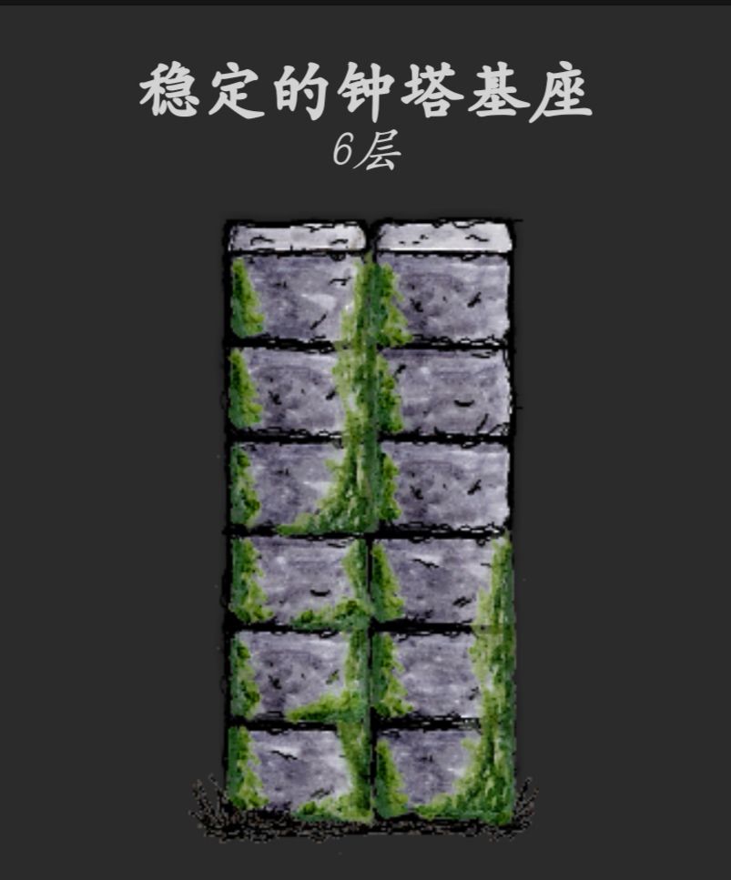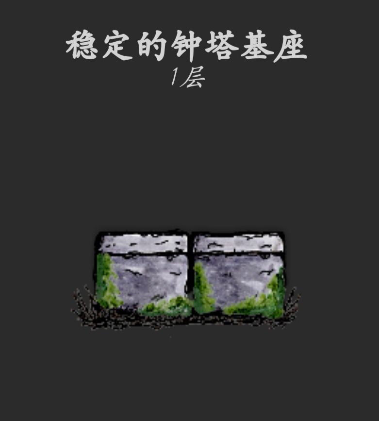 11,钟楼稳定后,再往上放两块石头,重复等待、放石头、等待的步骤,钟楼底座总共六层,等到第六层底座稳定了之后,就可以进行下一步了