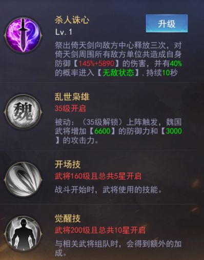 曹操定位就是一个超肉的增益BUFF,在技能方面防御越高伤害越高,并有40%的几率进入无敌状态(又是看脸的技能),所以在队伍中可以半个辅助也可以是纯坦,35级开启的被动技能让魏国武将的攻防都有个不错的提升~。