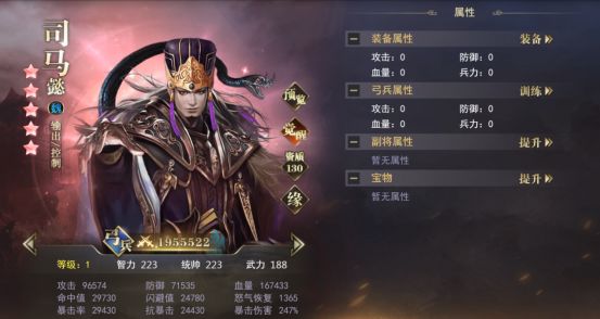 这几位武将都偏向于控制增益,但这套阵容的缺点也很明显,输出不够,只能慢慢磨血量,所以我们把资源优先给到偏向输出一点的司马懿,拉高一位武将的攻击,其他4位武将充当保护~