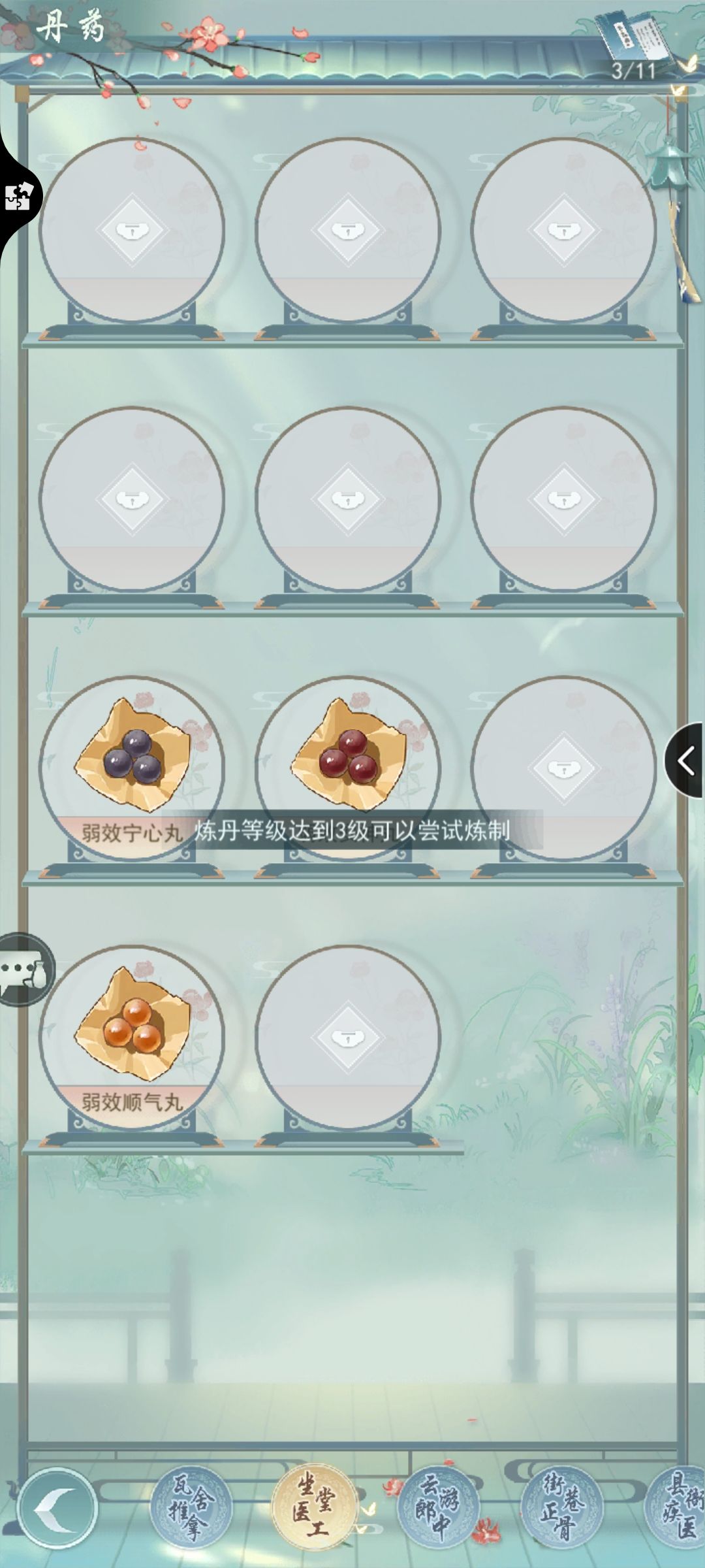 后两图空白的地方都不是一级能练出的药了,大家可以自己点击空白图鉴,它会告诉你炼丹等级达到几级才可以炼制,如下图