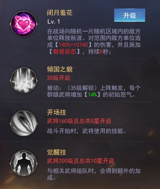 作为四大美女之一的貂蝉,第一个技能是闭月羞花,随机选中一个敌人对其造成伤害,并施加魅惑状态,(你怎么舍得打人家呢呜呜呜呜呜),35级后解锁被动技能,给自家武将提升14%的怒气值,(就问你怕不怕,一群愤怒的大汉朝你冲来)