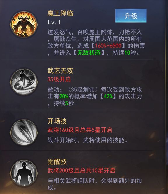 吕布之所以要放在队伍的前面是因为吕布 对周围敌人造成伤害并进入10秒的无敌状态,35级后开启武艺无双,每次受到敌方攻击都有几率提升自己的战斗力,让自己越战越勇,这这嗜血能力谁能不爱!!!
