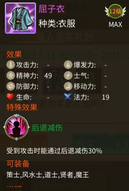 骚人墨客礼包,卖点是屈子衣的后退减伤,比较适合没有精神防御的脆皮,减伤效果明显、而且加精神与法力。