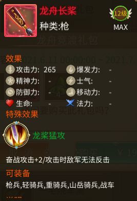 龙舟竞渡礼包,卖点奋战+2(就是普通攻击结束后可以再次攻击攻击范围内的另外2个敌人)这个配合上带袭扰特性的武将伤害可观,而且攻击敌人后敌人无法反击。