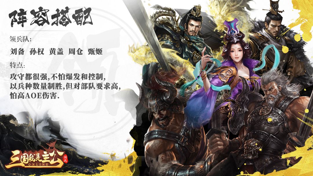 这套阵容搭配不受国家阵容限制,对一些喜欢各种自由的组合的小伙伴非常好,阵容搭配刘备、孙权、黄盖、周仓、甄姬