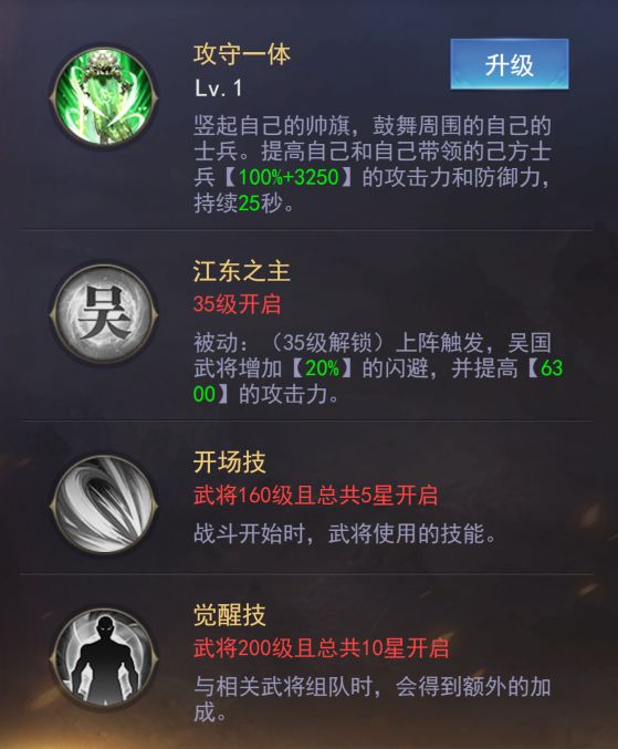 孙权前期的技能也是通过帮助自己和带领的己方士兵提供攻击力和防御力,让自己变得能扛能打,35级后解锁被动技能帮助吴国将领提高闪避率和攻击力,(这不搭配一个吴国武将分说不过去哦)