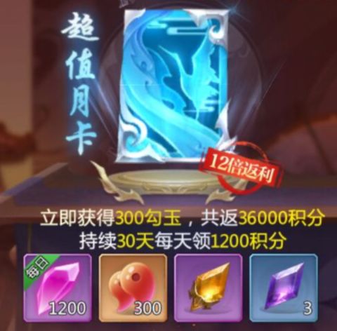 奖励内容:1、超值月卡礼包:激活月卡可以立即获得300勾玉,接下来30天内每天可领1200积分。分在游戏中的重要性相信就不用小刀再过多介绍啦~(PS:已有月卡的,需要在当前月卡到期后才能使用)