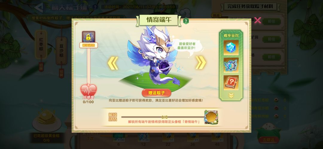 ⑸粽子赠送:可以给三个亚比:天天、银河、共工,记得点一下箭头移动过去。红枣粽给天天 ,豆沙粽给银河,鲜肉粽给共工(按顺序给就行了,依次对应)