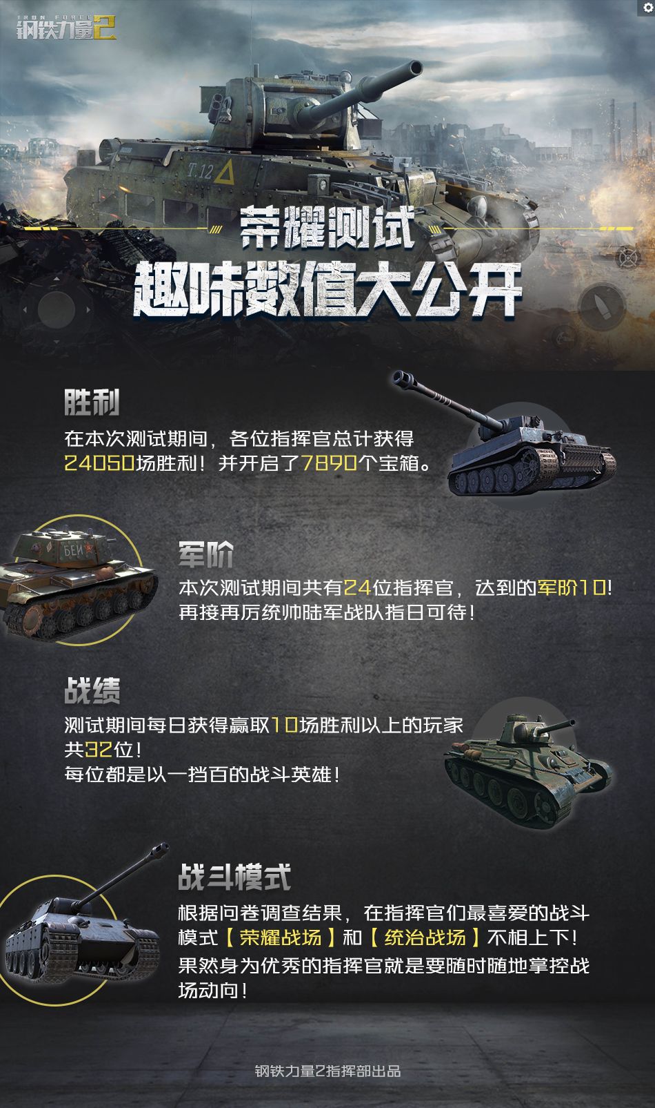 感谢大家参与《钢铁力量2》此前的荣耀测试!在测试结束的这一周时间内,我们仔细的阅读了各位指挥官们给我们的留言和建议,并且制定了一系列的优化方案,将会在之后继续加班加点努力在下一次测试时展现给各位指挥官!